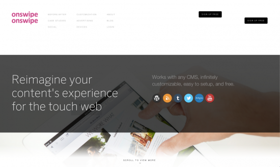 例如Onswipe就用了一个优雅的字体达成独特的卖点。这可以让使用者感觉到产品是时尚而具有创意的。还有,这行字也相当清楚明确,搭配适合的字体使用,更为加分。值得注意的是,他们放的是web font,而不是用图,不但可以增强SEO,也不会在跨装置的时候产生解析度的问题。