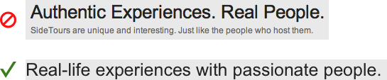 sideTour的网站就满特别而有趣的,但是使用者却没有办法从塬本的标题中看出独特的卖点是什么。他们的标题使用太广泛的形容词,每个网站都可以用;不如仔细想想怎么样才最能形容你的产品,例如上图,第二句会比第一句明确很多。