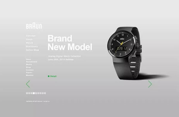 在这个例子中,他们把页头和页尾的概念统统去掉了。反而更像一个交互式杂货摊。从左向右的排列,就基本完成了内容层次的排布,有助于让排版更加直观。用于分隔导航和内容的界面就不需要了。取而代之的是漂亮的产品惊艳全场。